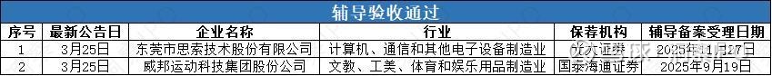 3月24日-3月31日,有2家公司境内(沪深两市)发行上市辅导验收通过。