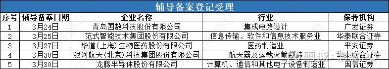 3月24日-3月31日,有5家公司境内(沪深两市)发行上市辅导备案登记获受理。