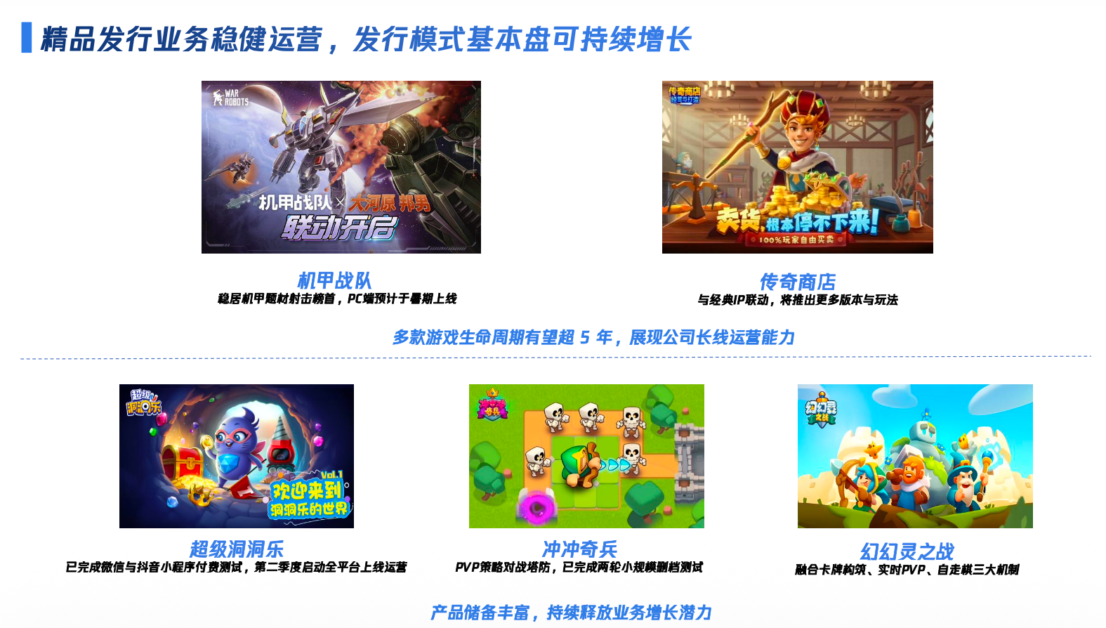 与此同时,公司持续引入海外精品作为增量来源(《冲冲奇兵》已完成两轮小规模删档测试。《幻幻灵之战》已在海外获得良好反响),形成“存量长青+新品补充”的结构,这使发行业务具备更强的稳定性与可预期性。