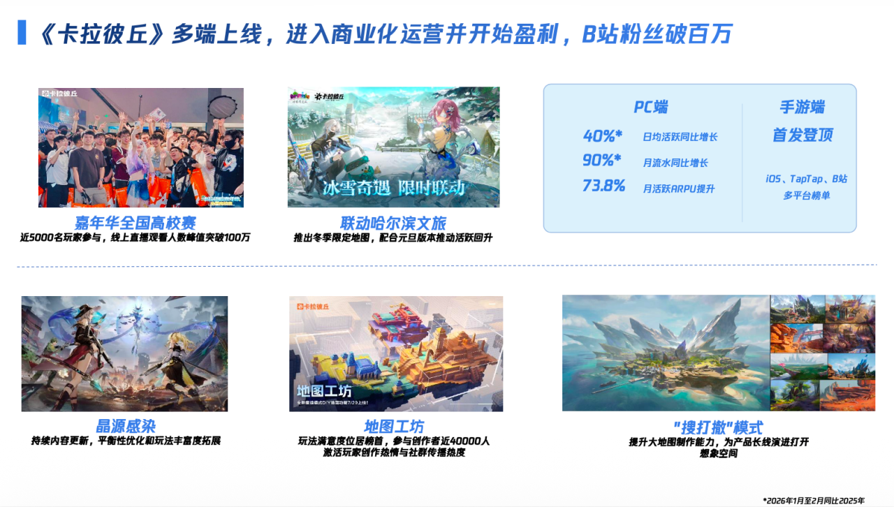 期内,《卡拉彼丘》多端上线并进入商业化运营。PC端于2026年初实现日均活跃同比增长40%,月流水同比增长90%,月活跃ARPU提升73.8%。手游端于2025年10月首发即登顶iOS、TapTap、B站等多平台榜单。