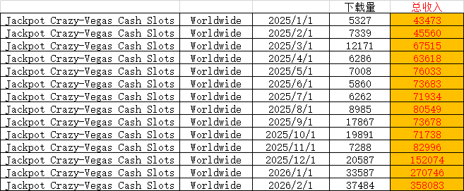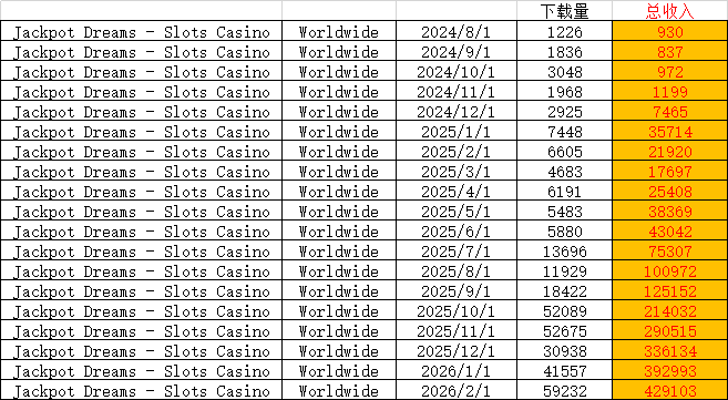 这款游戏2021年就面世,一直在打磨没怎么推。 从2025年12月开始上量,流水连续4个月高速增长,为15/27/35万美元,预计2026.3流水在42万美元左右,继续增长。 有点像2020年三四月间新创娱游第一款Cash Tornado™ Slots - Casino的爆发点(月流水20-50万之间)。