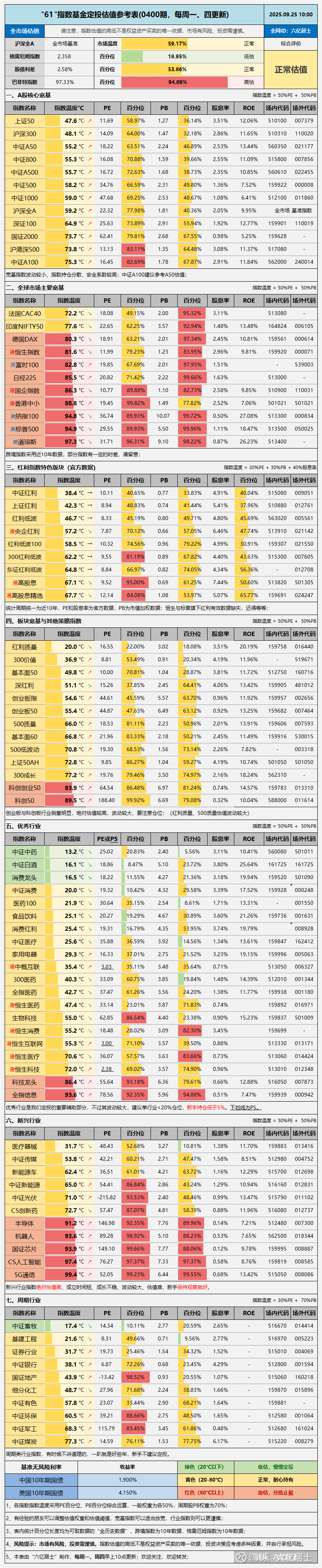 不仅如此,对于大部分指数,61采用50%+50%的双指标权重。如果是强周期行业,PE的有效性更低,指数温度调整为PE30%+PB70%的模式,增加PB权重提升稳定性。除此之外,估值表内还有股息率、ROE等指标,辅助我们行稳至远。