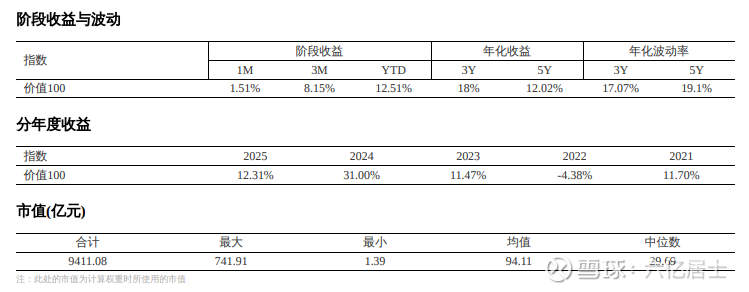 5年年化12.02%且年化波动率为19.01%,整体风险收益比较高。指数样本市值中位数为29.69亿,均值为94.11亿,为中小盘风格。