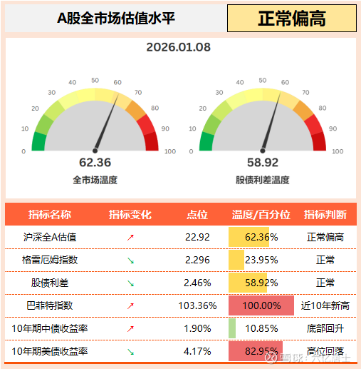 沪深全A估值升至62.36℃,股债利差升至58.92℃,全市场综合评估升至:正常偏高。