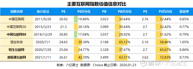 因此在看恒生科技、恒生互联网、港股通互联网时,除了关注它们自身的估值,61也建议同时参考中国互联网指数的估值。中国互联网成立于2011年9月20日,历史更长,哪怕成份股与权重有差异,也能提供一个更完整的参照坐标。