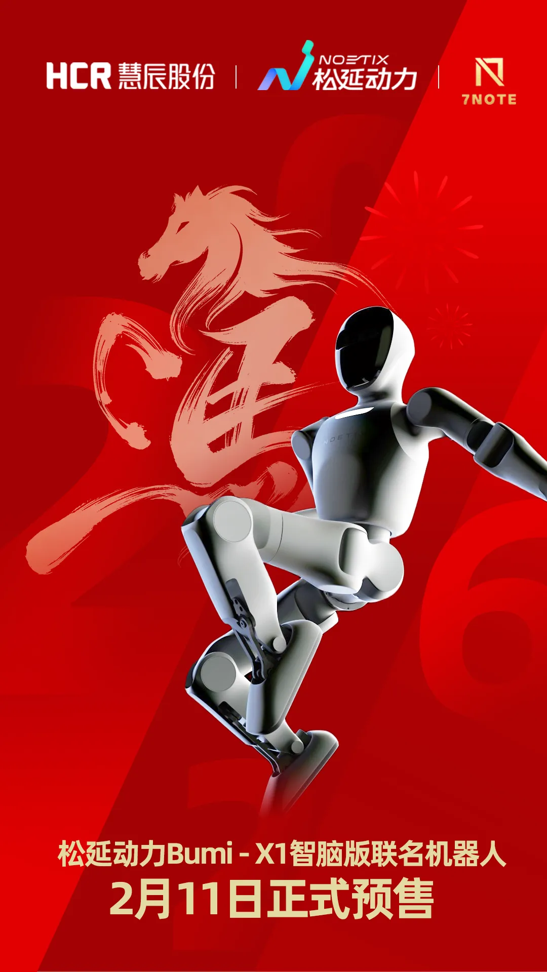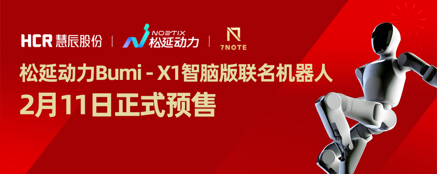 松延动力人形机器人即将亮相2026年央视总台春晚舞台。值此契机,其机器人智脑生态合作伙伴慧辰股份,携手7NOTE机器人星空场,正式开启基于松延动力机器人的Bumi-X1联名款人形机器人预售。该产品在松延动力Bumi机器人中融合慧辰股份HCR-“X”机器人智脑技术,并将于2月11日同步登陆多个线验中心,助力人形智能机器人走进寻常百姓家。