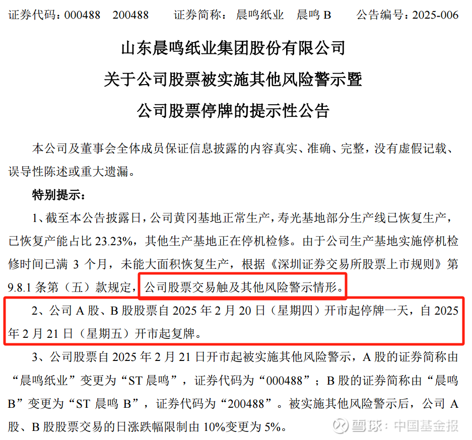 【导读】晨鸣纸业将被实施其他风险警示,自2月20日开市起停牌一天