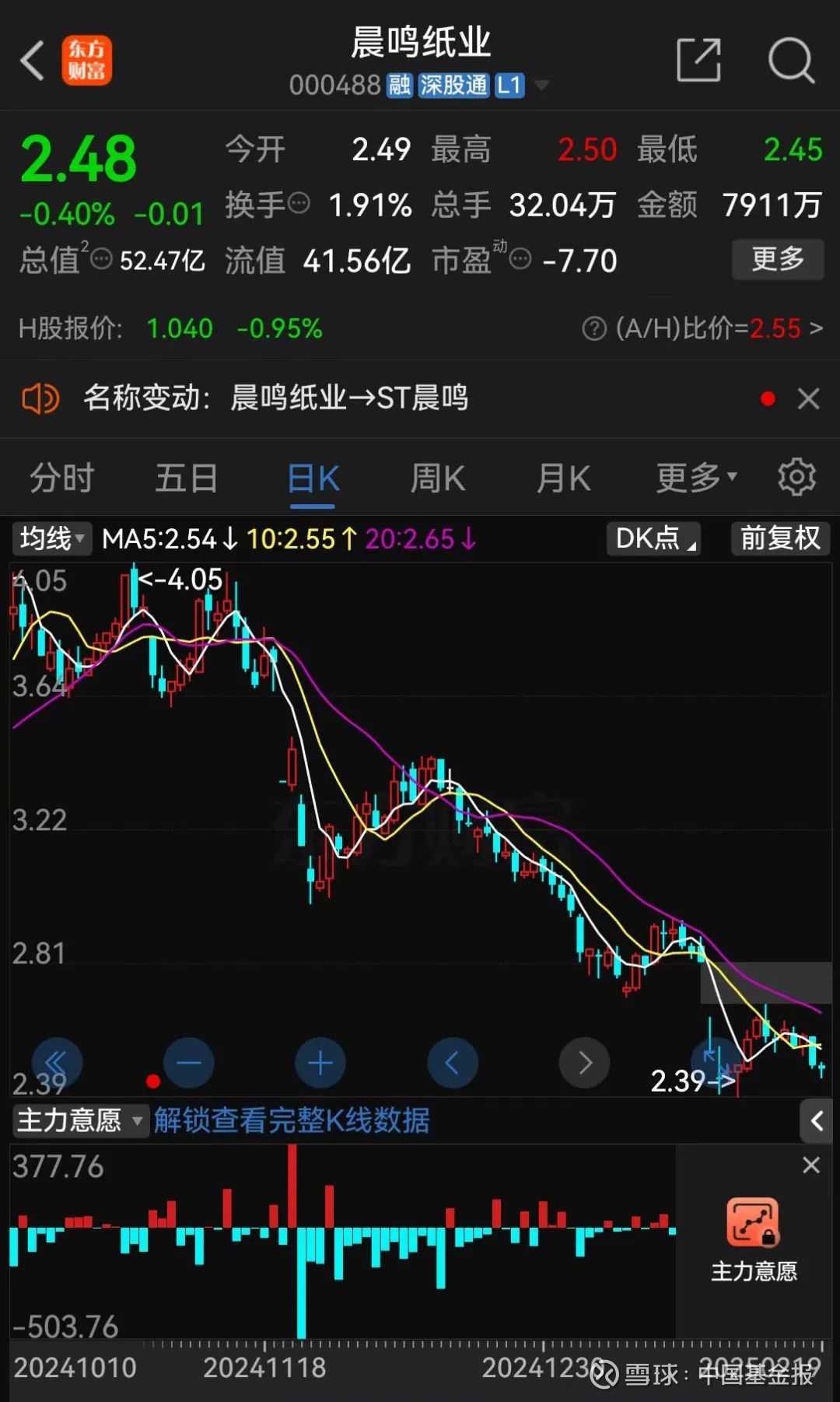 截至2月19日收盘,晨鸣纸业A股股价报2.48元/股,总市值为52.47亿元。