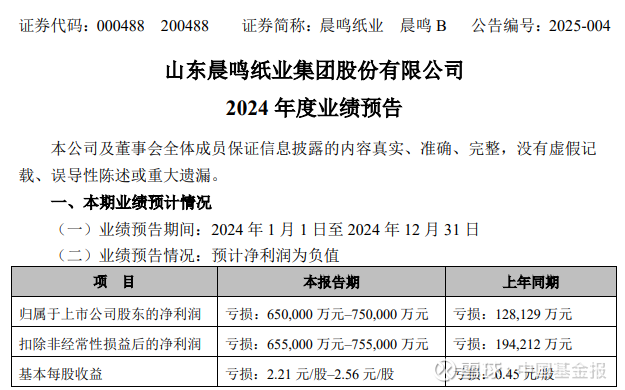 1月24日,晨鸣纸业发布业绩预告显示,公司预计2024年归母净利润亏损65亿元至75亿元。