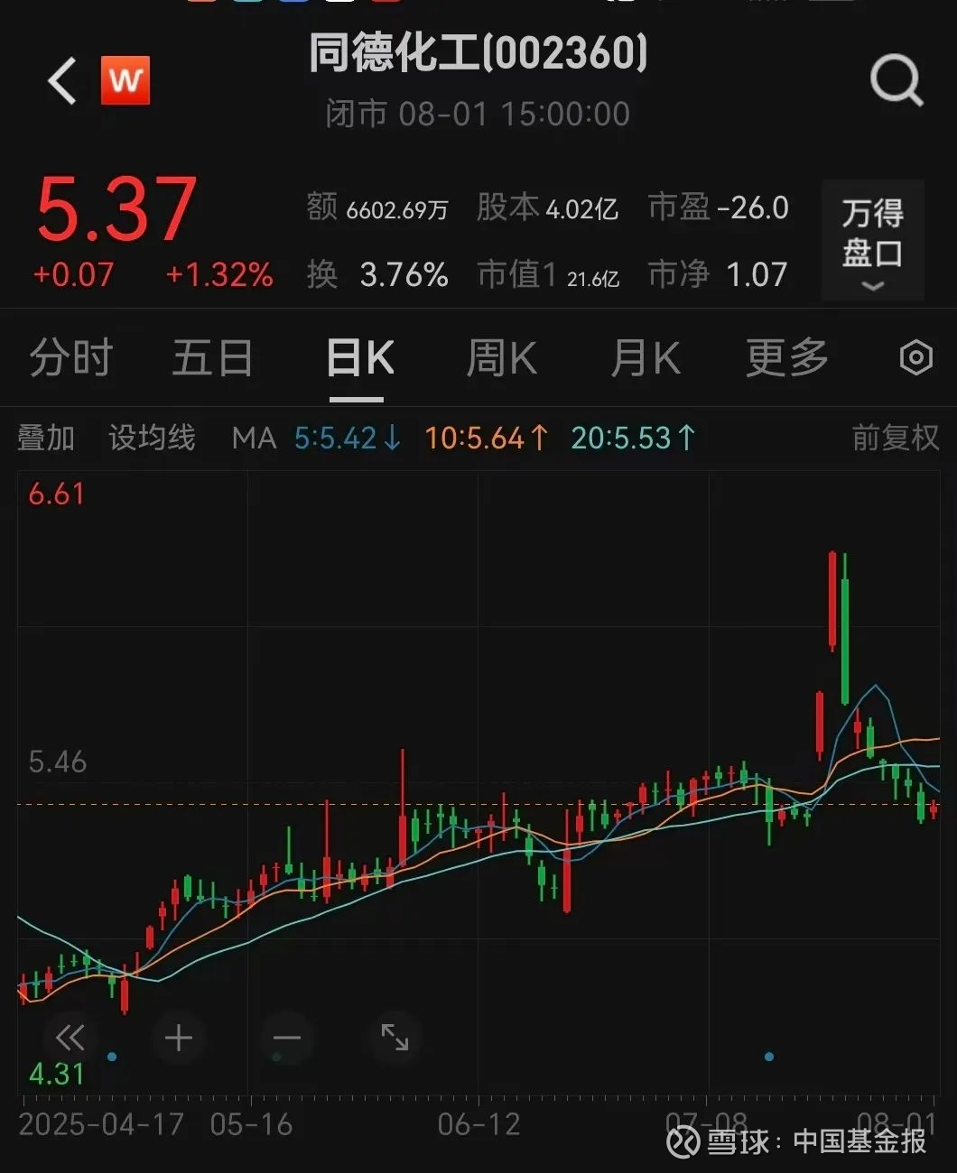 8月1日,同德化工报收于5.37元,总市值为21.6亿元。