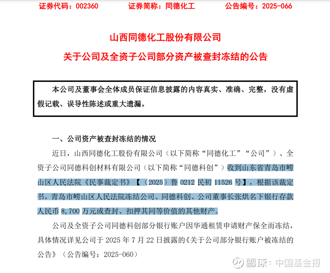 8月1日晚间,山西省民爆龙头企业同德化工(证券代码:002360)发布公告称,公司及全资子公司同德科创近日收到青岛市崂山区人民法院《民事裁定书》。根据该裁定书,青岛市崂山区人民法院冻结公司、同德科创、公司董事长张烘名下银行存款8700万元或查封、扣押其同等价值的其他财产。
