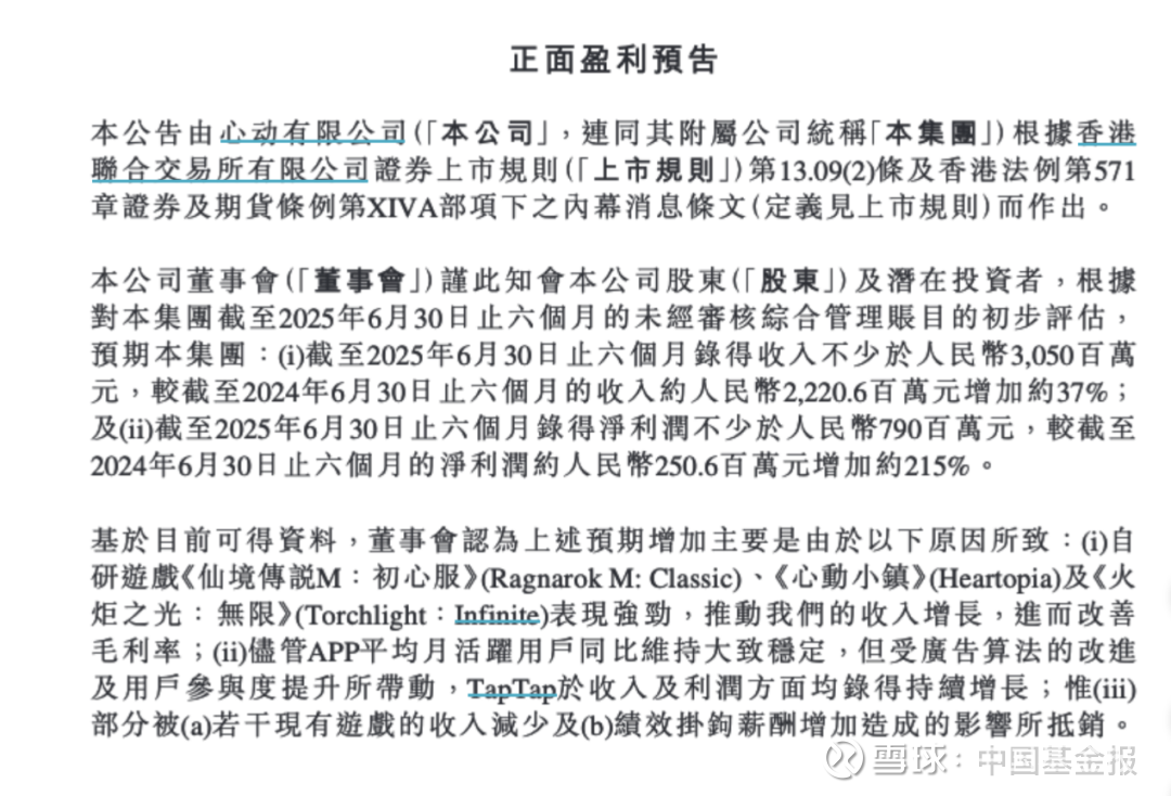 8月4日晚,心动公司披露的业绩预告显示,经初步评估,预计公司2025年上半年将录得不少于30.5亿元的收入,较上年同期的22.21亿元增长约37%。预计上半年公司将录得净利润不低于7.9亿元,较上年同期的2.51亿元同比增长约215%。