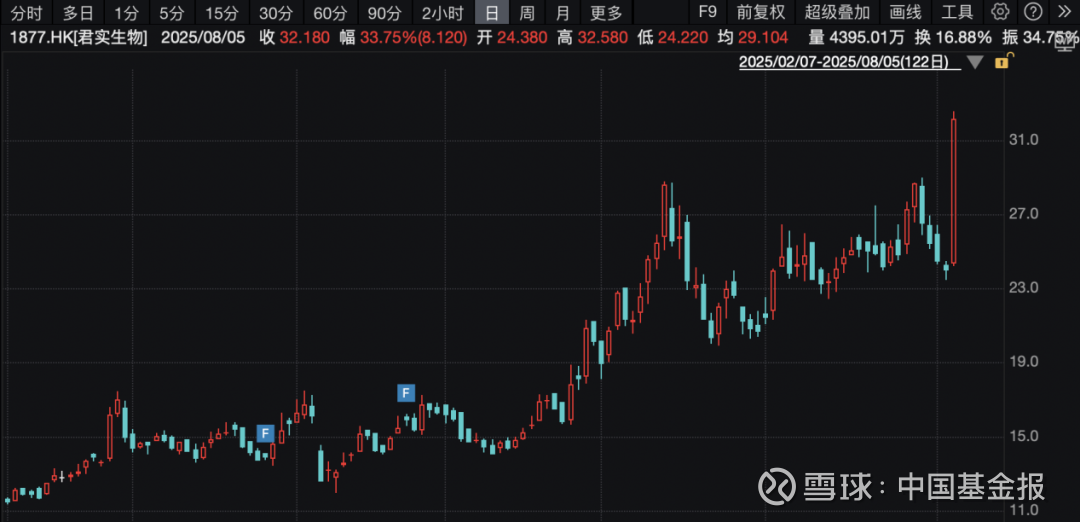 8月5日,君实生物大涨33.75%,报32.18港元/股。今年以来,截至8月5日,君实生物累计涨幅为177.89%。