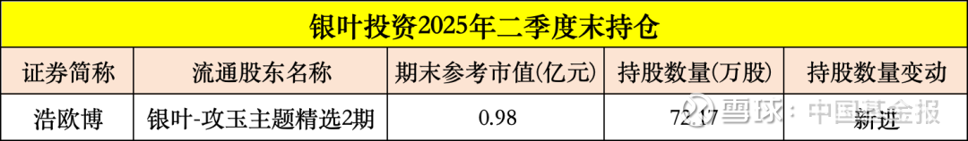 银叶投资旗下私募产品在今年二季度新买进浩欧博72.17万股,期末持有市值为9800万元。浩欧博主要从事体外诊断试剂的研发、生产和销售,今年以来该股股价上涨了18.63%。
