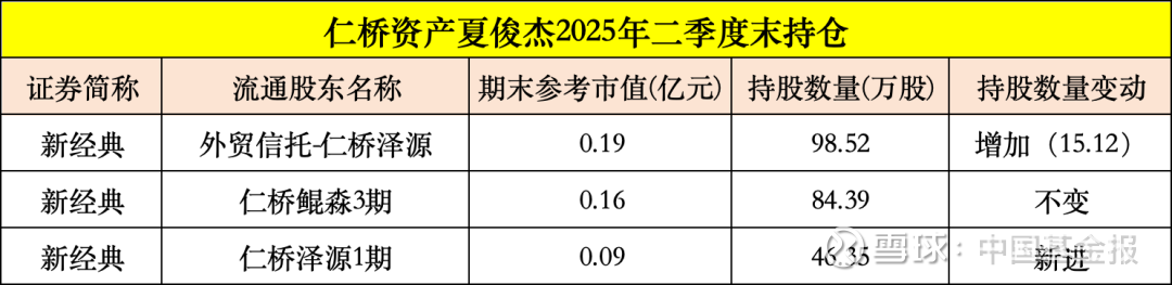 夏俊杰掌舵的仁桥资产,旗下仁桥泽源1期等三只产品在二季度增持了新经典,合计持有229.26万股,期末持股市值为4400万元。新经典年初至今股价上涨了3.44%。