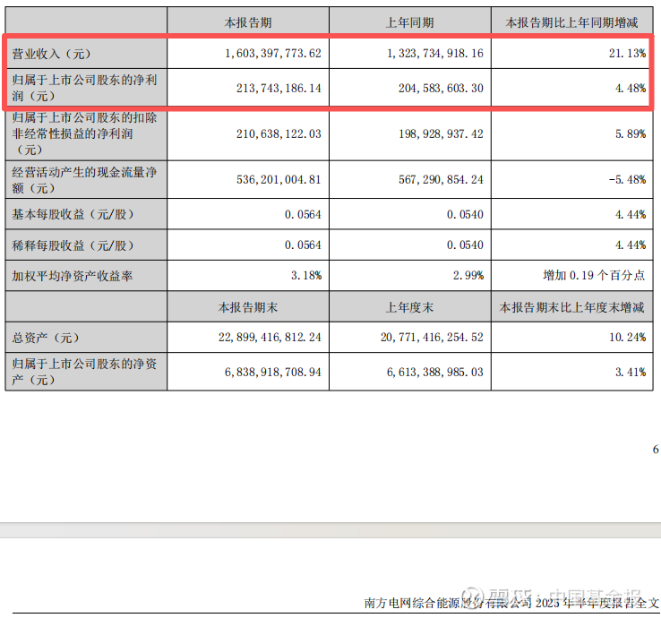 2025年上半年,南网能源的营业收入同比增长21.13%至16.03亿元,归母净利润同比增长4.48%至2.14亿元。