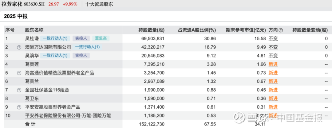 半年报显示,今年二季度末葛卫东以个人名义现身拉芳家化的流通股东名单,但仅买进了159万股,期末参考市值仅3600万元,为第八大流通股东;葛卫东家族的葛贵莲、葛贵兰同样现身该股股东榜,分别买进了739.52万股、296.71万股,期末参考市值分别为1.66亿元、6700万元。二季度末,葛卫东家族三个人合计持有拉芳家化的市值为2.69亿元。