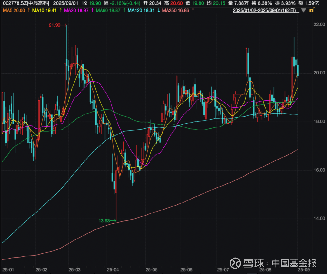 但中晟高科今年股价走势波折,4月一度跌至13.93元/股的位置,此后出现大幅反弹,截至9月1日,该股报收于19.90元/股,今年以来涨幅为13.97%,最新总市值仅25亿元。