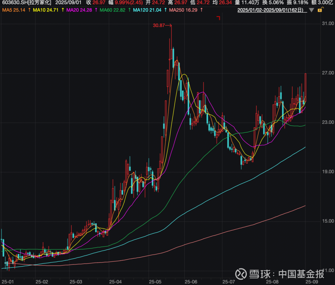 值得一提的是,9月1日早间拉芳家化开盘股价直线拉涨,很快封住了涨停板。该股今年以来走势强劲,5月下旬一度涨至30.87元/股,但此后出现大幅调整,7月下旬该股重拾升势。截至9月1日,拉芳家化报收于26.97元/股,今年以来涨幅高达96.52%,最新总市值为61亿元。