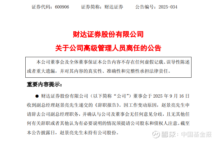 9月16日,财达证券公告称,公司董事会于2025年9月16日收到副总经理赵景亮递交的《辞职报告》。因工作变动原因,赵景亮申请辞去公司副总经理职务,并确认与公司及董事会无任何意见分歧。辞职后,赵景亮将不在公司担任任何职务。