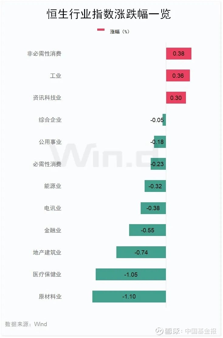 行业表现方面,恒生行业指数中非必需性消费行业指数上涨0.38%,工业指数上涨0.36%,资讯科技业指数上涨0.30%。跌幅方面,原材料业指数下跌1.10%,医疗保健业指数下跌1.05%,地产建筑业指数下跌0.74%。