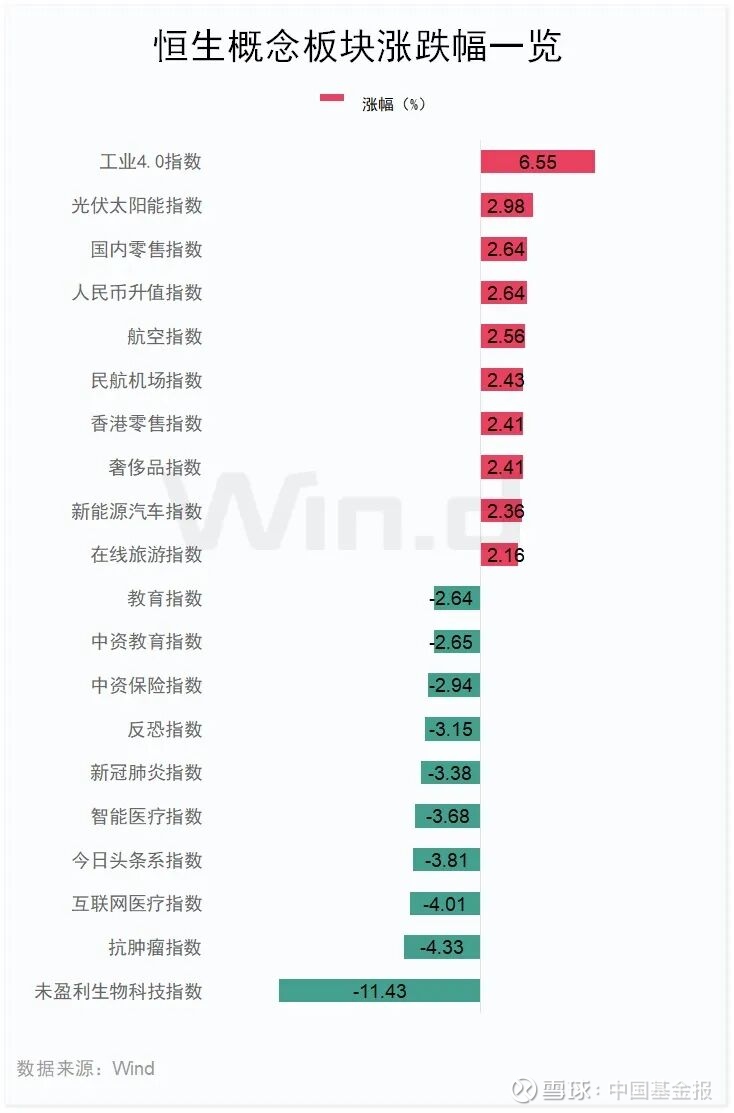 Wind概念板块涨跌不一,工业4.0指数领涨6.55%,光伏太阳能指数涨2.98%,国内零售指数涨2.64%,未盈利生物科技指数跌11.43%,抗肿瘤指数跌4.33%,互联网医疗指数跌4.01%。
