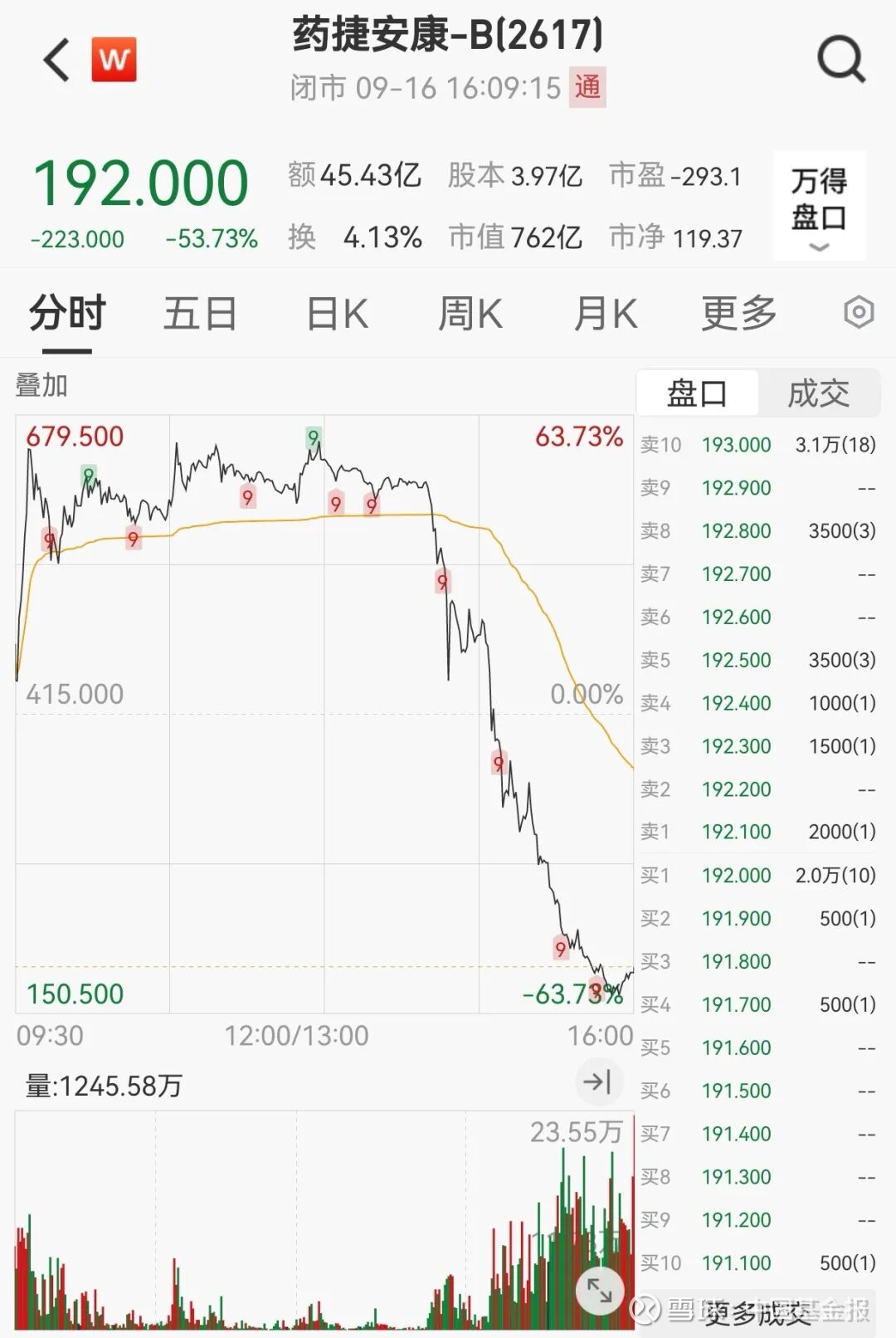 昨日因公司核心产品II期临床试验获中国国家药监局默示许可,股价狂飙115.58%的药捷安康,今日股价巨幅震荡,早盘一度大涨63.73%,午后上演惊天跳水,全天跌53.73%,收于192.00港元/股。