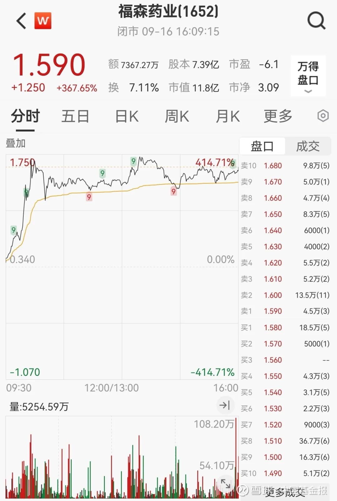 另一家药企——福森药业股价一度狂飙414.71%!全天收于1.59港元/股,大涨367.65%。