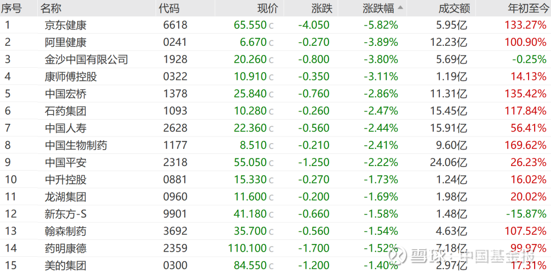 恒生指数成份股中35只上涨,50只下跌。京东健康下跌5.82%,阿里健康下跌3.89%,金沙中国有限公司下跌3.80%,领跌恒生指数成份股。医药股普跌,石药集团跌2.47%,中国生物制药跌2.41%。