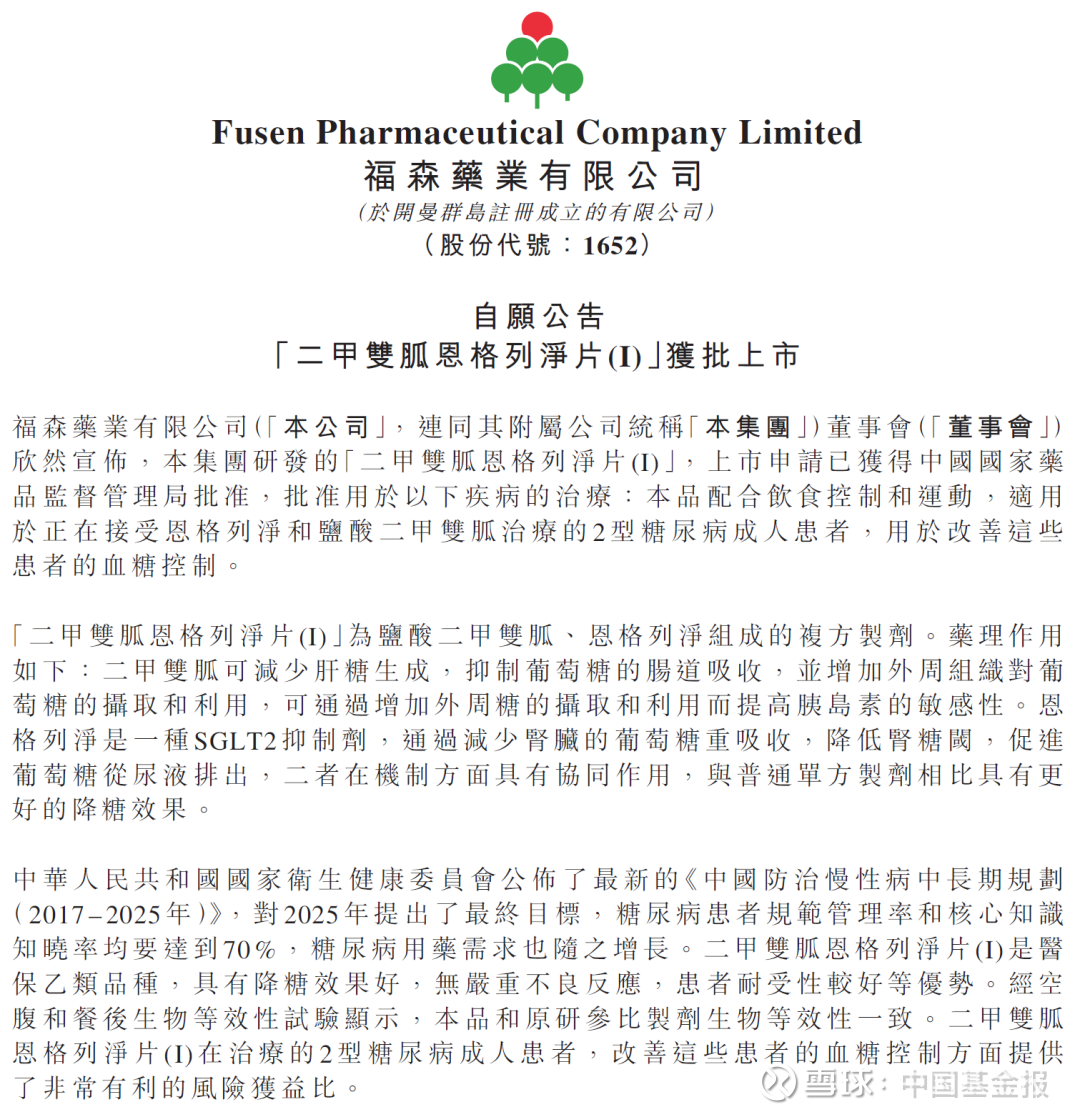 福森药业发布《自愿性公告》称,公司研发的“二甲雙胍恩格列淨片(I)”已获中国国家药品监督管理局批准上市,用于配合饮食控制和运动,改善2型糖尿病成人患者的血糖控制。