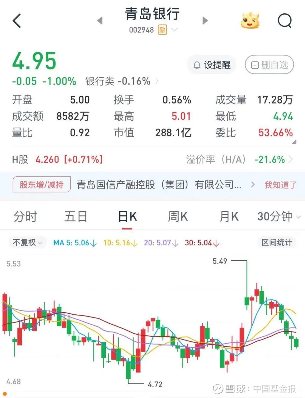 截至9月17日午间收盘,青岛银行A股报4.95元/股,总市值为288.1亿元。