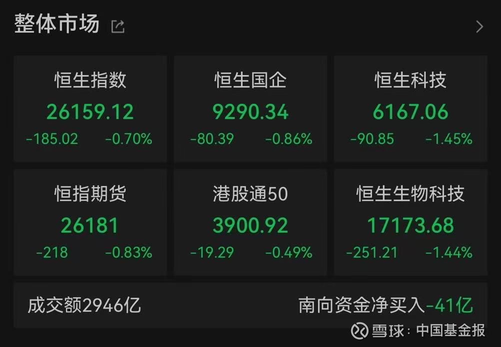 截至收盘,恒生指数下跌0.70%,报收于26159.12点;科技指数下跌1.45%,报收于6767.06点;国企指数下跌0.86%,报收于9290.34点。