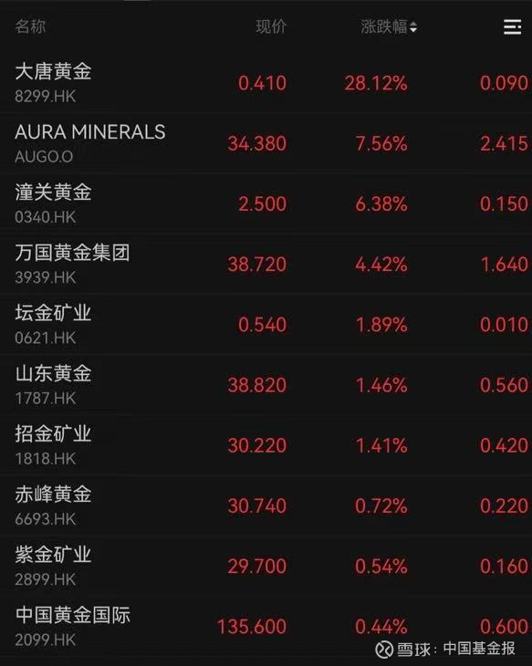 港股黄金股逆市活跃,大唐黄金大涨28.12%。潼关黄金、万国黄金和山东黄金等均收涨。