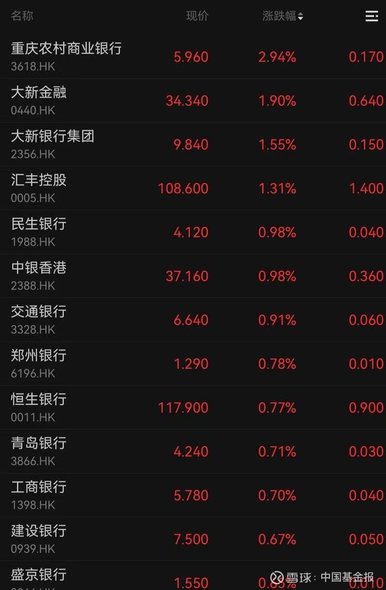 内资行重庆农村商业银行、郑州银行和青岛银行分别上涨2.94%、0.78%、0.71%,香港本地银行大新银行集团和外资行汇丰控股分别上涨1.55%、1.31%。
