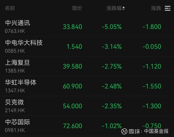 港股半导体板块今日盘中一度大幅下挫,尾盘再度回升跌幅收窄。中兴通讯收跌5.05%,上海复旦、华虹半导体和贝克微跌超2%。