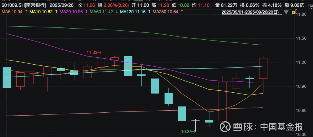 本月,银行股经历回调后反弹。9月22日,南京银行股价回调至10.46元/股。截至9月26日,南京银行报收于11.26元/股。