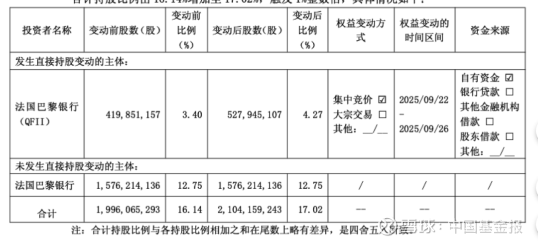 9月28日,南京银行发布公告称,法国巴黎银行(QFII)于2025年9月22日至2025年9月26日期间,以自有资金通过上海证券交易所交易系统以集中竞价交易方式增持本公司股份108,093,950股,占本公司总股本的0.87%。法国巴黎银行及法国巴黎银行(QFII)合计持股比例由16.14%增加至17.02%。