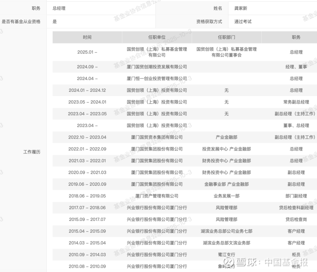 值得一提的是,国贸创领私募的核心团队配置兼具“国资基因”与“市场化经验”。除董晓亮外,国贸创领私募的总经理龚家新,拥有15年从业经验,曾在兴业银行厦门分行、厦门资产任职;2019年6月加入厦门国贸集团,担任财务投资中心、产业金融部总经理等职务;2023年4月加入国贸创领私募,先后担任副总经理、总经理等。