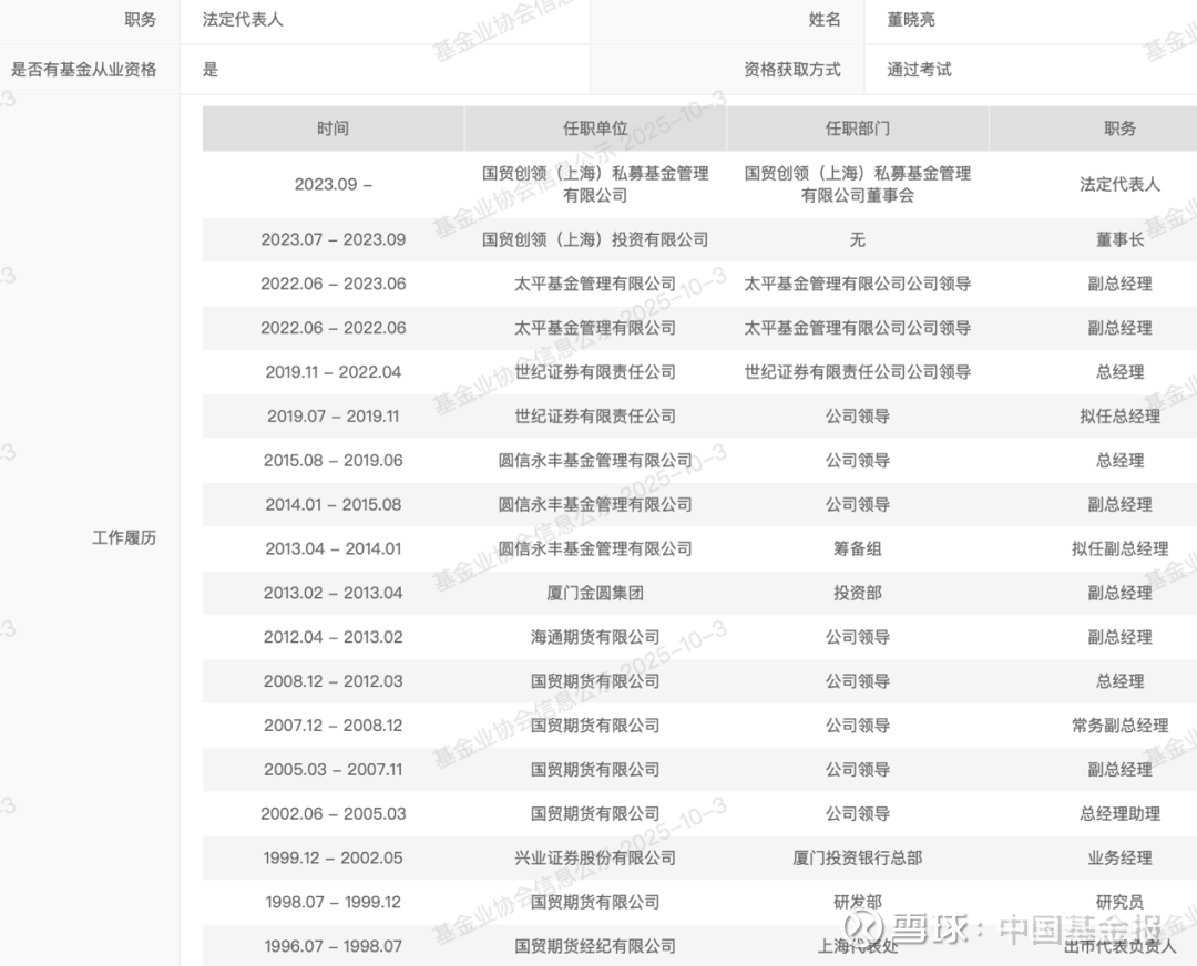 值得注意的是,国贸创领私募法定代表人董晓亮,是一位有着近30年金融从业经验的老将,职业生涯足迹遍布期货、证券、基金等多个领域,曾任多个金融机构的总经理,与厦门国贸体系渊源颇深。