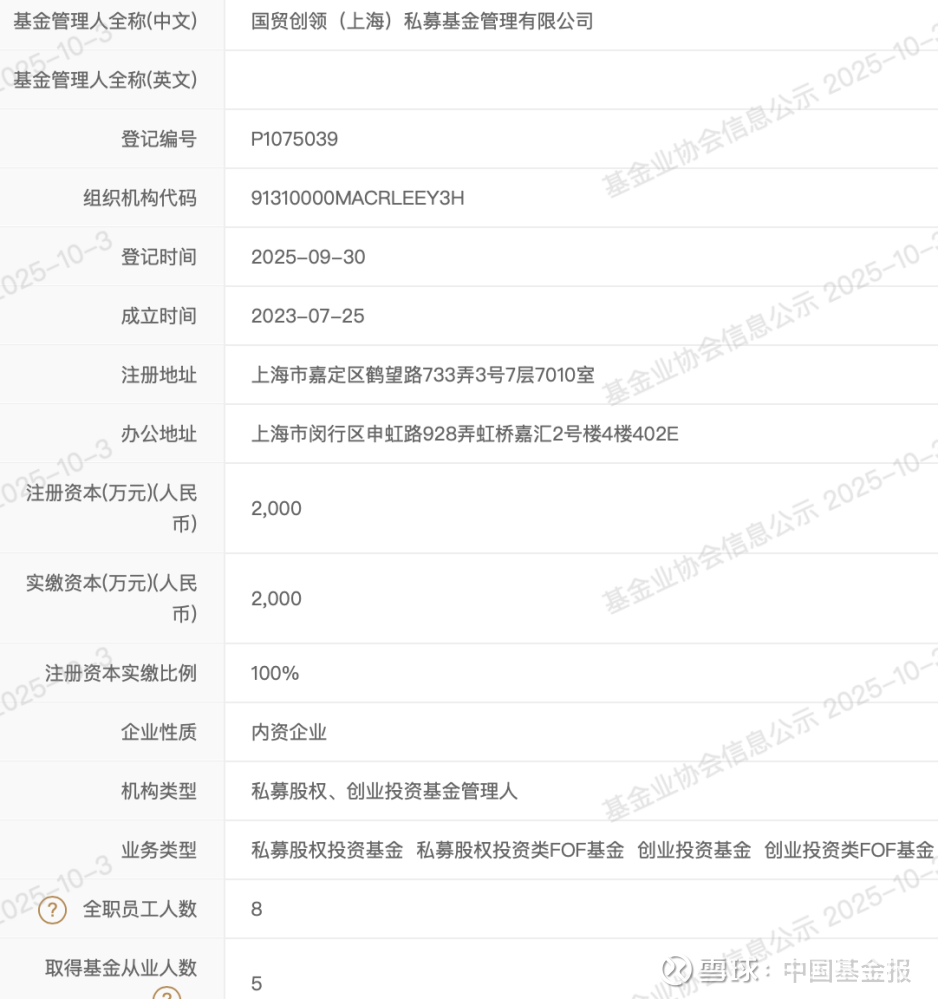 具体来看,国贸创领私募成立于2023年7月25日,注册资本为2000万元,注册于上海嘉定,办公地位于闵行,目前有8名全职员工。该公司于2025年9月30日完成私募管理人备案登记,机构类型是私募股权、创业投资基金管理人。