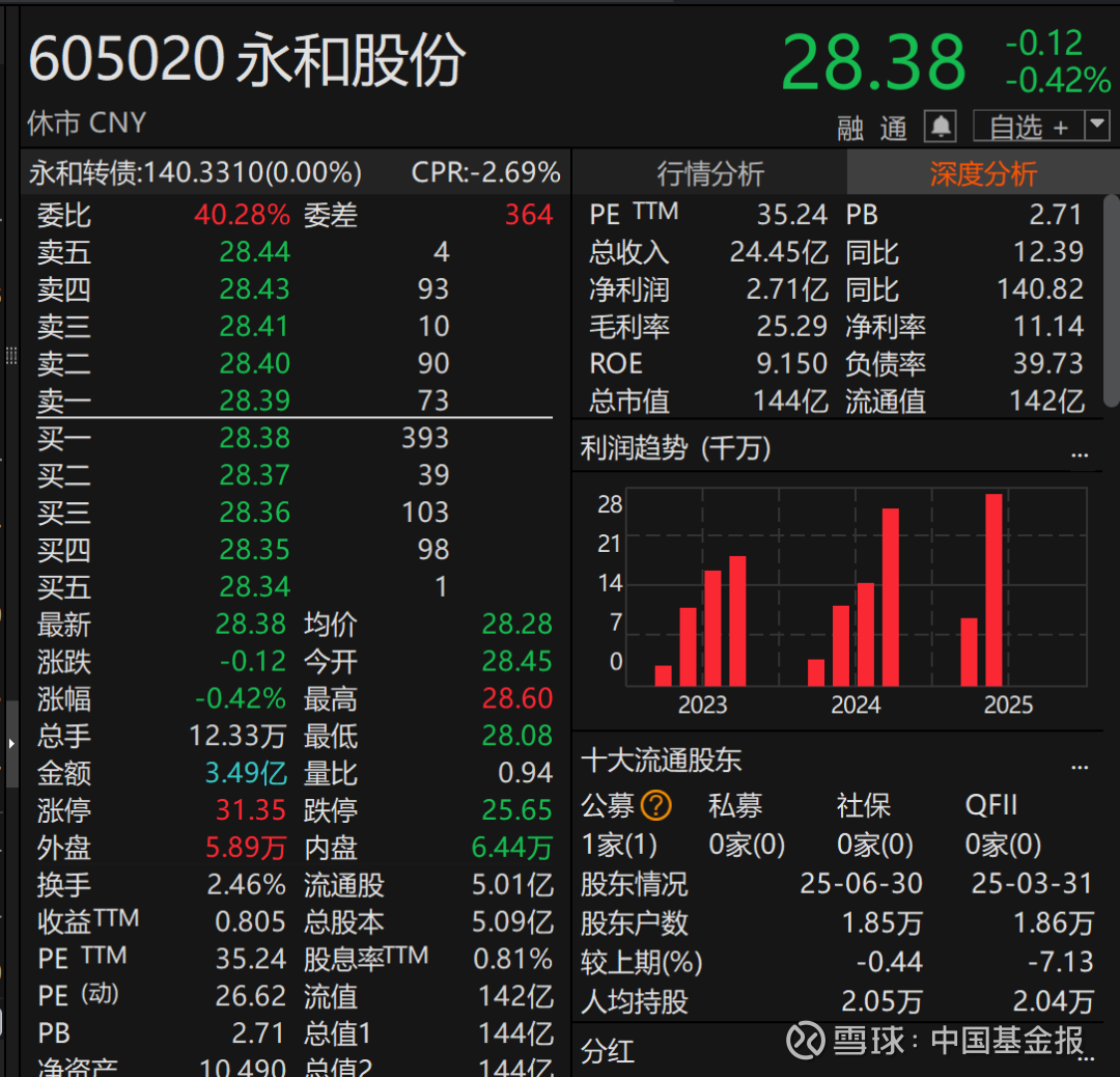 截至9月30日,永和股份报28.38元/股,总市值为144亿元。