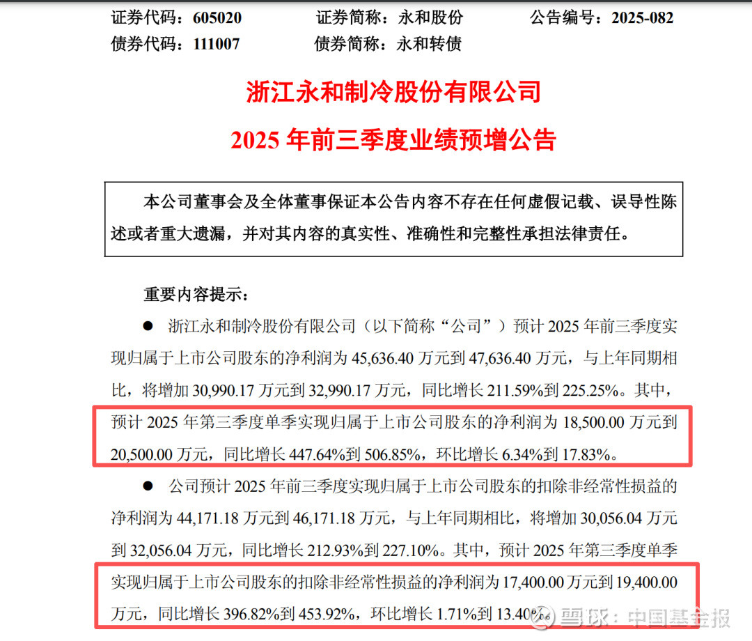 10月8日晚间,永和股份发布2025年前三季度业绩预增公告。公司预计前三季度实现归母净利润4.56亿元至4.76亿元,同比增长211.59%至225.25%。