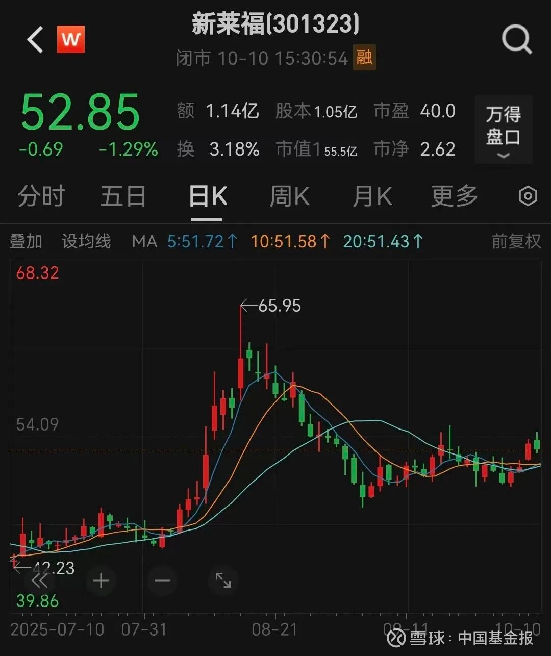 10月10日,新莱福股价以52.85元/股报收,最新市值为55.5亿元。