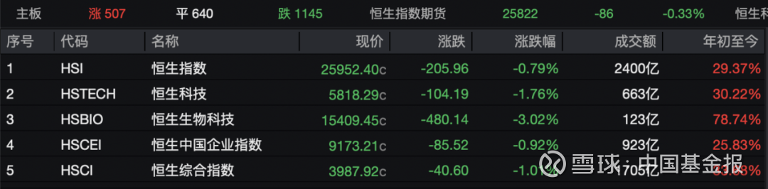 11月4日,三大指数集体下跌。其中,恒生指数收跌0.79%,报25952.4点;恒生科技指数下挫1.76%,报5818.29点;恒生中国企业指数下跌0.92%,报9173.21点。全日大市成交额为2400亿港元,较前一交易日的2286.76亿港元有所增加,南向资金净流入98.32亿港元。