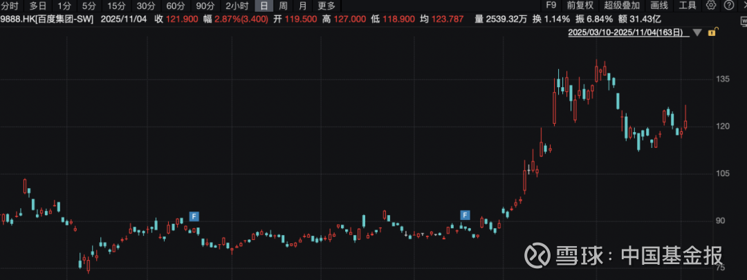 开盘之初,百度集团-SW股价急速拉高,一度触及127港元/股,涨幅超7.0%。当日百度集团-SW收涨2.87%,报收于121.9港元/股。