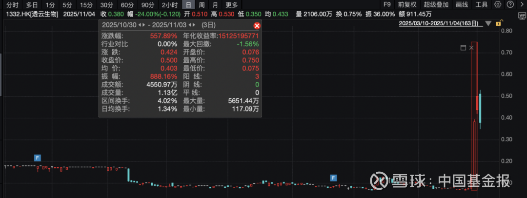 透云生物此前三个交易日暴涨。Wind数据显示,10月30日至11月3日,透云生物累计涨幅达557.89%。