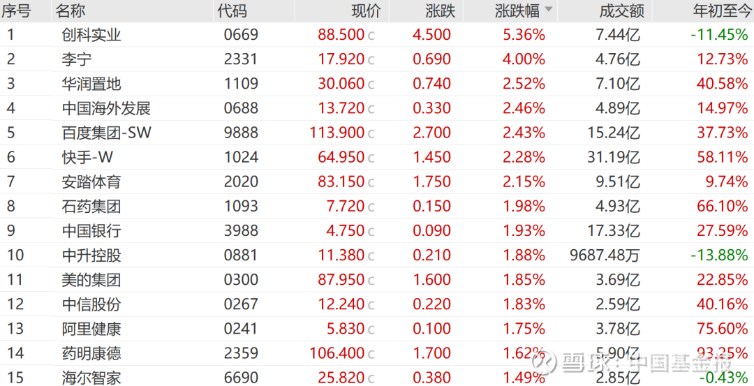 银行、地产走强,半导体、汽车走弱。创科实业涨5.36%,李宁涨4.00%,华润置地涨2.52%。