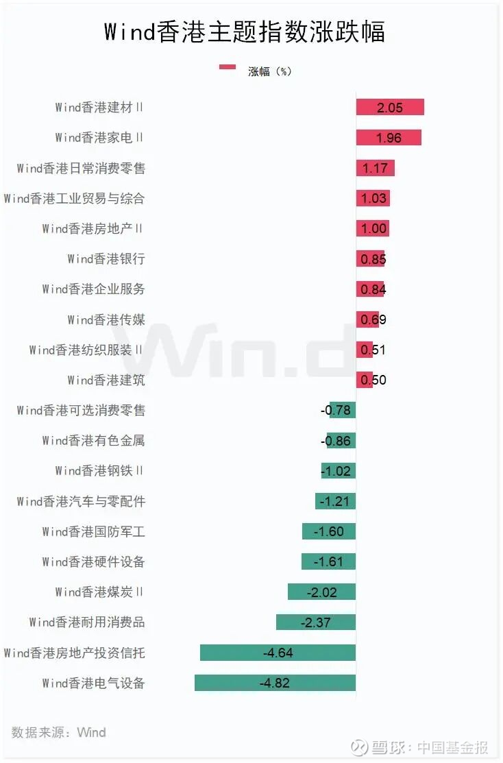 主题行业方面,建材行业指数上涨2.05%,家电行业指数上涨1.96%,日常消费零售行业指数上涨1.17%;跌幅方面,电器设备行业指数下跌4.82%,房地产投资信托行业指数下跌4.64%,耐用消费品行业指数下跌2.37%。