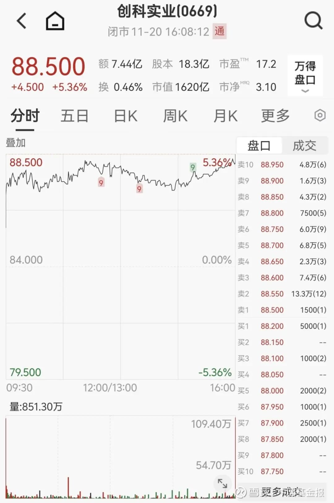11月20日,受股份回购并注销利好推动,创科实业高开高走,以全天最高价88.50港元/股报收,涨5.36%。