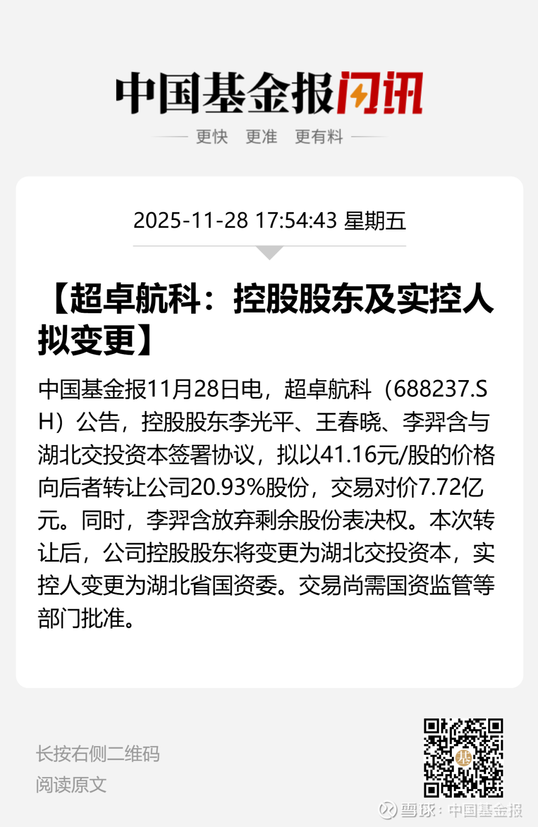 11月28日晚间,超卓航科公告称,控股股东李光平、王春晓、李羿含与湖北交投资本投资有限公司(以下简称交投资本)于11月28日签署协议,拟以41.16元/股的价格向后者转让公司20.93%股份,交易对价为7.72亿元。同时,李羿含放弃剩余股份表决权。本次转让后,公司控股股东将变更为交投资本,实控人变更为湖北省国资委。